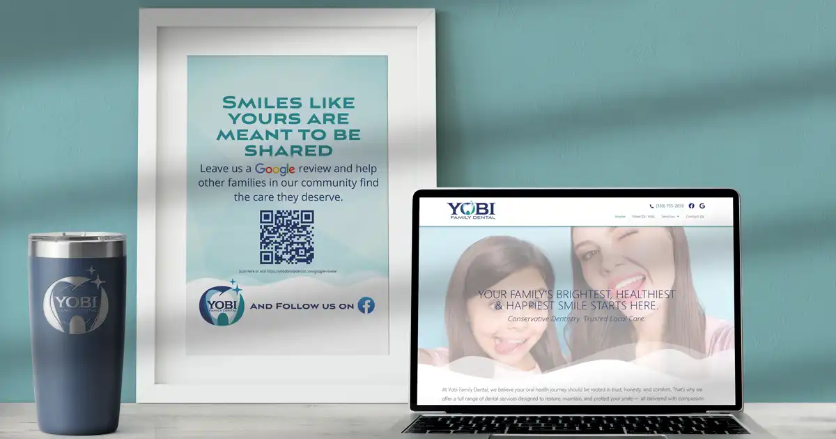 From the logo and business cards to the full site and all the words on it, everything ties together to make Yobi Family Dental feel like the go-to spot for families in Youngstown, Boardman, Poland, and pretty much anywhere in the Mahoning Valley.